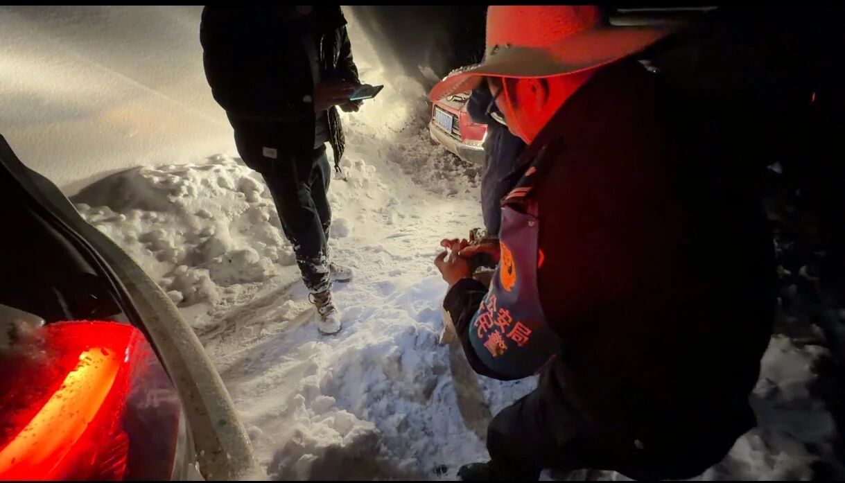 接警后,察拉派出所民警迅速驱车赶赴现场。因大雪持续弥漫,能见度极低,群众无法精准描述自身具体位置,民警经耐心搜寻,成功找到被困车辆及人员,确认二人身体状况良好。随后,民警不顾严寒与路面湿滑,一边用工具清理车辆周边积雪,一边尝试用警车拖拽,在风雪中持续奋战3小时,最终成功帮助被困车辆脱困。