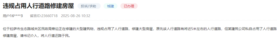 “违规占用人行道路修建房屋”近日,西藏拉萨一网友通过人民网“领导留言板”留言,称“位于拉萨市生态路城关区民政局旁边正在修建的大型建筑物,违规占用了人行道路,修建大型房屋,原先该人行道路有将近5米的人行道路,但某建筑公司私自占用了人行道路修建房屋,请相关部门介入,将人行道还路于民。”