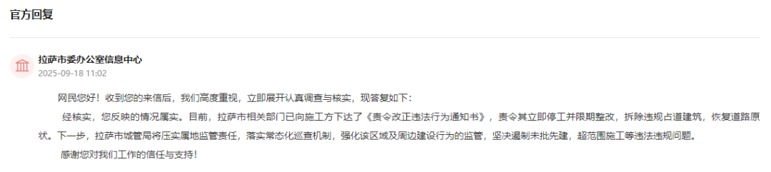 经核实,网友反映的情况属实。目前,拉萨市相关部门已向施工方下达了《责令改正违法行为通知书》,责令其立即停工并限期整改,拆除违规占道建筑,恢复道路原状。