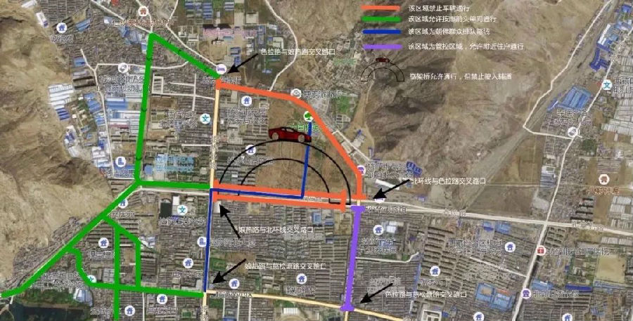 3、色拉寺封控区域:娘热路与色拉路交叉路口(军区总医院门前T型路口)禁止任何车辆由西向东和由北向南行驶。北环线与色拉路交叉路口禁止车辆向北行驶;娘热乡路段单向通行,由军区总医院门前路口进,北环线出;慈松塘路与色拉路交叉路口以北、北环线与色拉路交叉路口以南为管控区域,允许附近住户车辆进出,其他无关车辆禁止驶入。北环线与色拉路、娘热路禁止所有车辆驶入辅道。