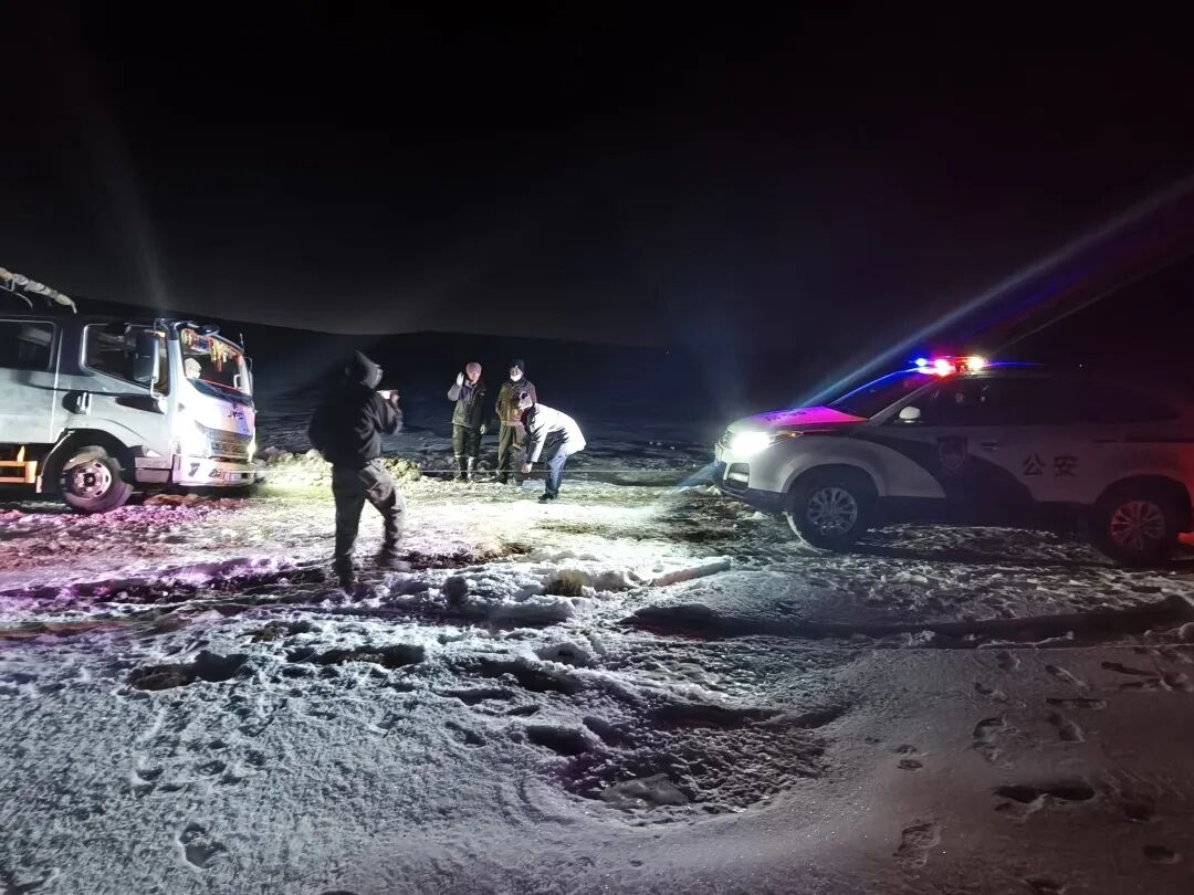 当晚21时许,在海拔超过5000米的高原,夜间气温已骤降至零下二十多度,路面形成严重暗冰。检查站警铃再次响起——塔尔玛乡三村附近又有车辆因轮胎打滑被困。刚刚经历下午高强度救援、尚未得到充分休整的民警们,不顾疲惫,再次义无反顾地奔赴新的救援地点。