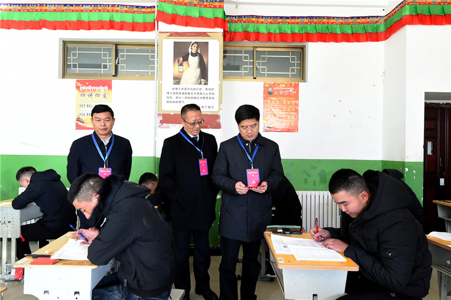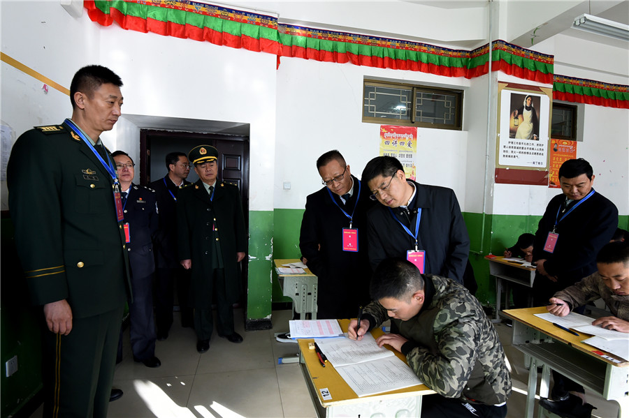 为认真贯彻落实党中央关于深化党和国家机构改革、公安现役部队改革的决策部署,按照公安部部署要求,近日,公安厅组织开展全区公安现役部队士兵转改考试。区党委常委、政法委书记何文浩同志,区党委政法委副书记、公安厅党委书记、厅长张洪波同志,区人社厅党委党组书记、副厅长解海源同志,区人社厅党组成员、副厅长邵昌同志,公安厅党委委员贾利国、黄东升、覃林泉、赵尔才同志,西藏公安边防总队党委书记、政治委员袁斌同志等一行前往拉萨考点现场视察巡考。
