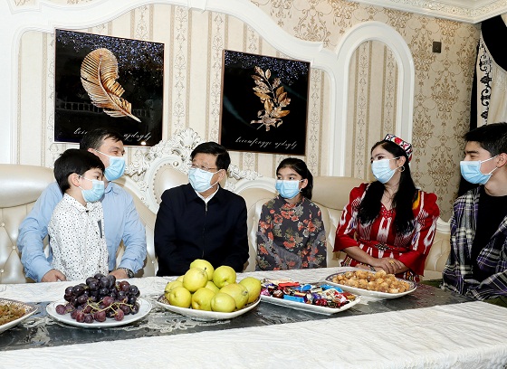 3月19日至24日,国务委员、公安部党委书记、部长赵克志在新疆调研。图为赵克志在乌鲁木齐市水磨沟区山水兰德小区乌斯曼·牙生家中与一家人促膝交谈。