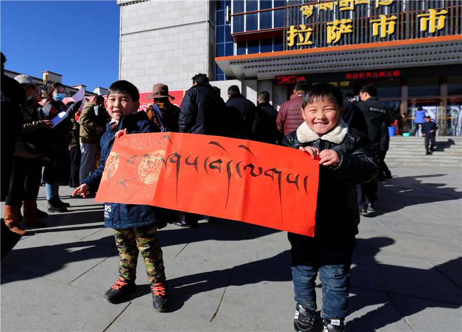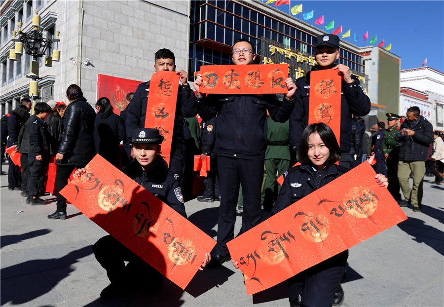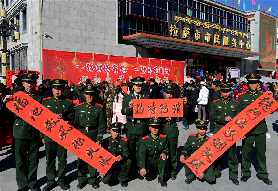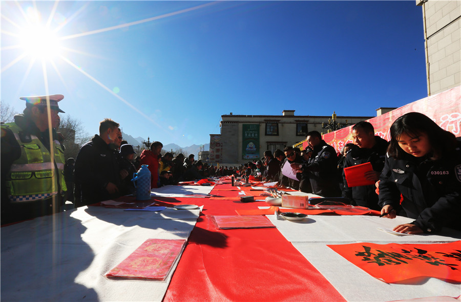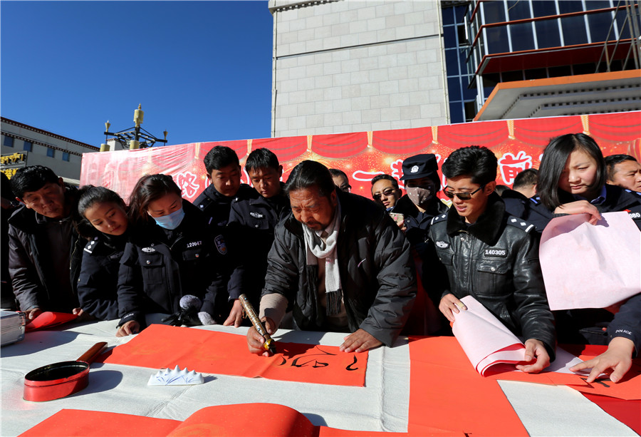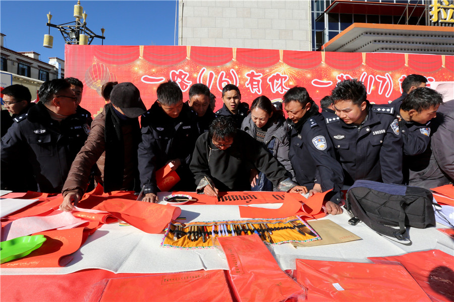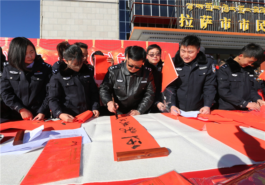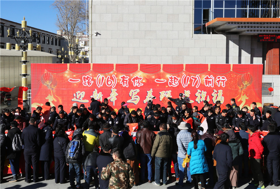 金鸡喜唱催春早,绿柳轻摇舞絮妍。在新春佳节即将来临之际,1月22日,由西藏自治区公安厅主办、拉萨市公安局承办的“一路(16)有你,一起(17)前行”迎新年、写春联、送祝福活动在拉萨市市民服务中心广场前举行。来自中国书法家协会、自治区书法家协会、拉萨市书法家协会的10多名书法家和我区人民警察、现役部队中的书法爱好者现场为拉萨市民书写春联,送上节日祝福。公安厅党委委员、副厅长幸远明同志亲临现场参加活动。