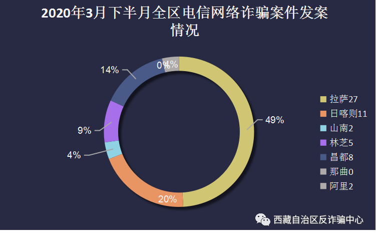 2020年3月16日至31日,全区共接警电信网络诈骗刑事警情55宗。同比下降15%,环比上升41%。其中拉萨接警27宗,同比上升3.8%,环比上升35%;日喀则接警11宗,同比下降31.25%、环比上升57.14%;山南市2宗,同比下降33.3%,环比持平;林芝市5宗、同比持平,环比上升66.6%;昌都市8宗,同比下降20%,环比上升60%;那曲市0宗,同比下降5宗,环比下降2宗;阿里2宗,同比上升2宗,环比上升2宗。