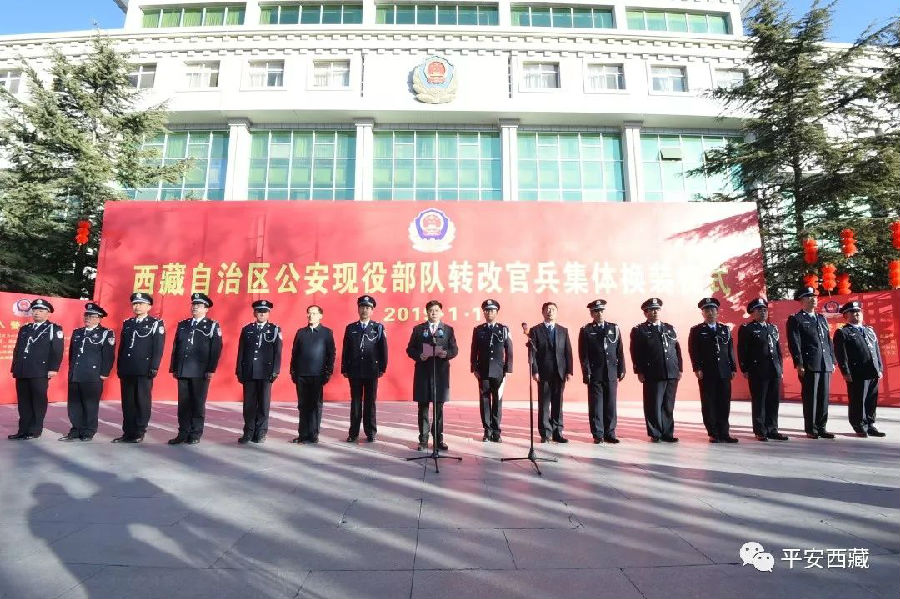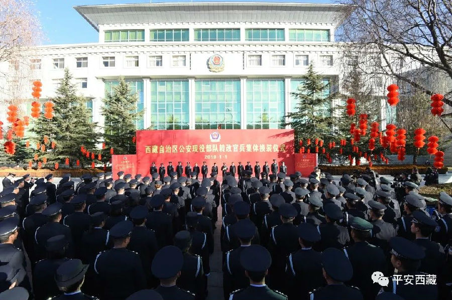 根据公安部的统一部署要求,2019年1月1日上午,公安厅隆重举行全区公安现役部队转改官兵集体换装仪式。区党委常委、政法委书记何文浩同志出席仪式并作重要讲话。区党委政法委副书记、公安厅党委书记、厅长张洪波同志主持仪式。仪式宣读了国务院、公安部授衔命令,举行了集体入警宣誓。西藏出入境边防检查总站、公安厅特勤局、反恐特侦队负责同志分别作了表态发言。在家公安厅党委班子成员和西藏出入境边防检查总站、公安厅特勤局、反恐特侦队班子成员以及部分转改官兵代表参加仪式。